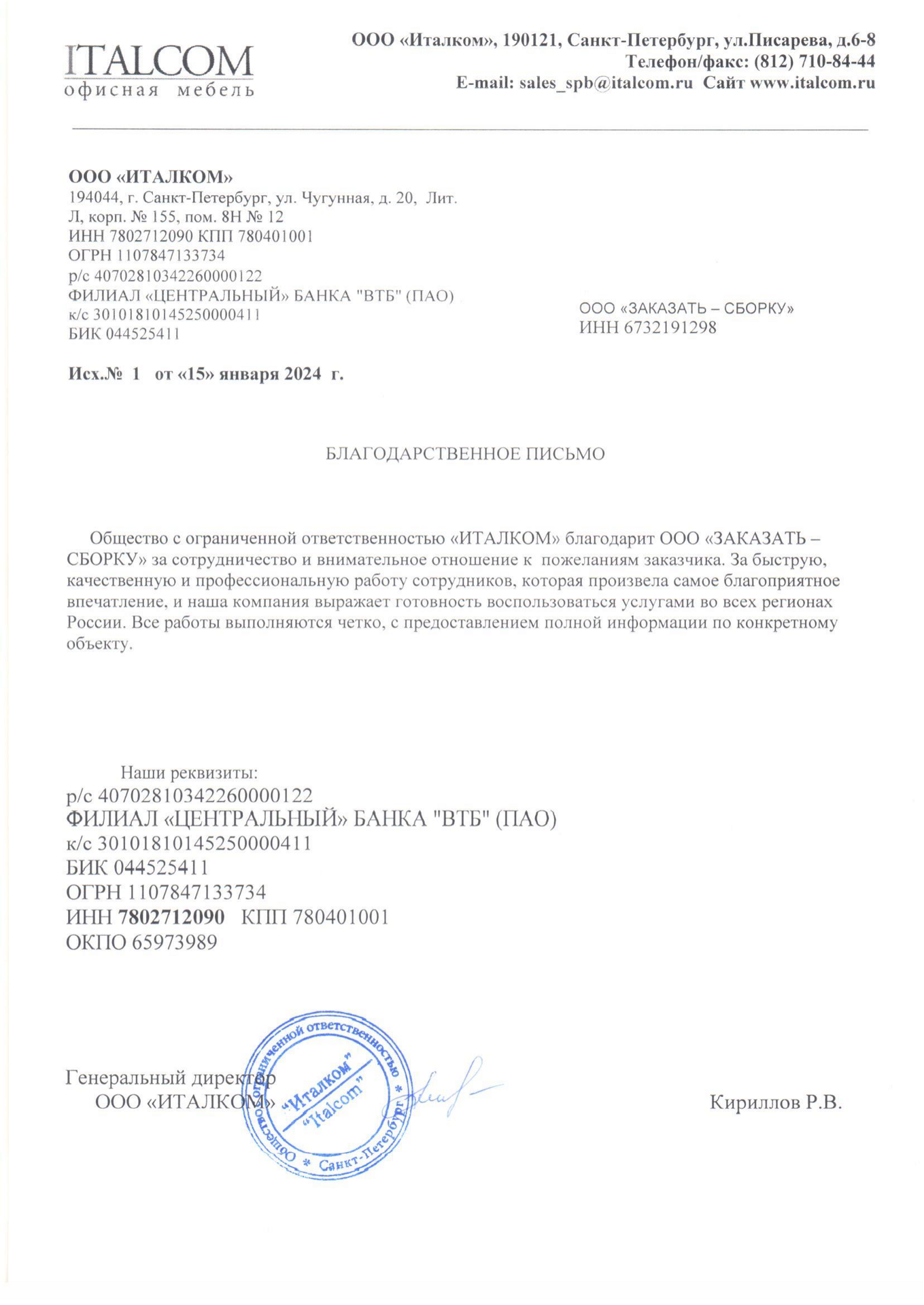 Также Оператор имеет право направлять Пользователю уведомления о новых продуктах и услугах, специальных предложениях и различных событиях. Пользователь всегда может отказаться от получения информационных сообщений, направив Оператору письмо на адрес электронной почты Sborka-RF@bk.ru с пометкой «Отказ от уведомлениях о новых продуктах и услугах и специальных предложениях».