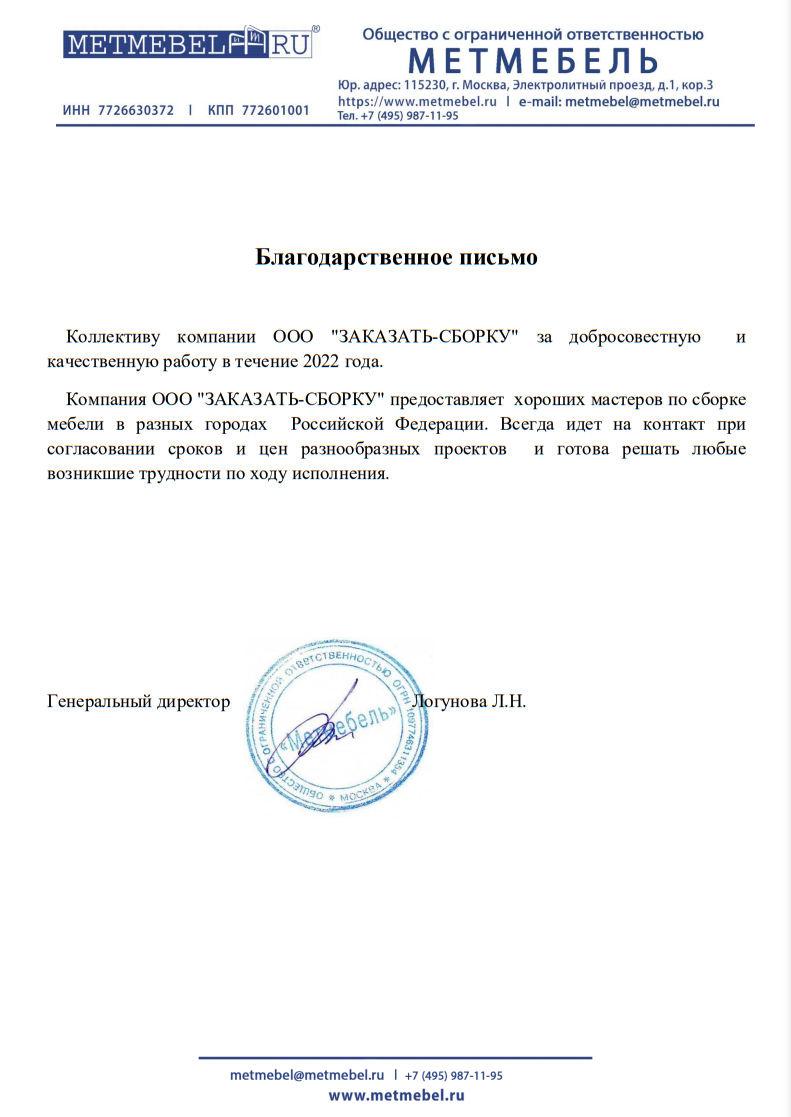 Все мастера имеют опыт работы от 3х лет и более и весь необходимый инструмент для сборки мебели. Кроме того, после каждого заказа мы получаем обратную связь от клиентов для принятия необходимых корректировок.